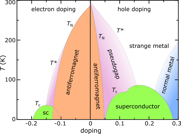 A schematic of the doping phase diagram of cuprate superconductors. Above the superconducting dome, a pseudogap phase emerges, where an energy gap appears only for electrons moving in specific directions in momentum space. One could imagine moving freely along a street (no gap) but encountering walls that block motion across it (energy gap), reflecting the directional nature of the pseudogap. [Holger Motzkau, CC BY-SA 3.0 , via Wikimedia Commons]