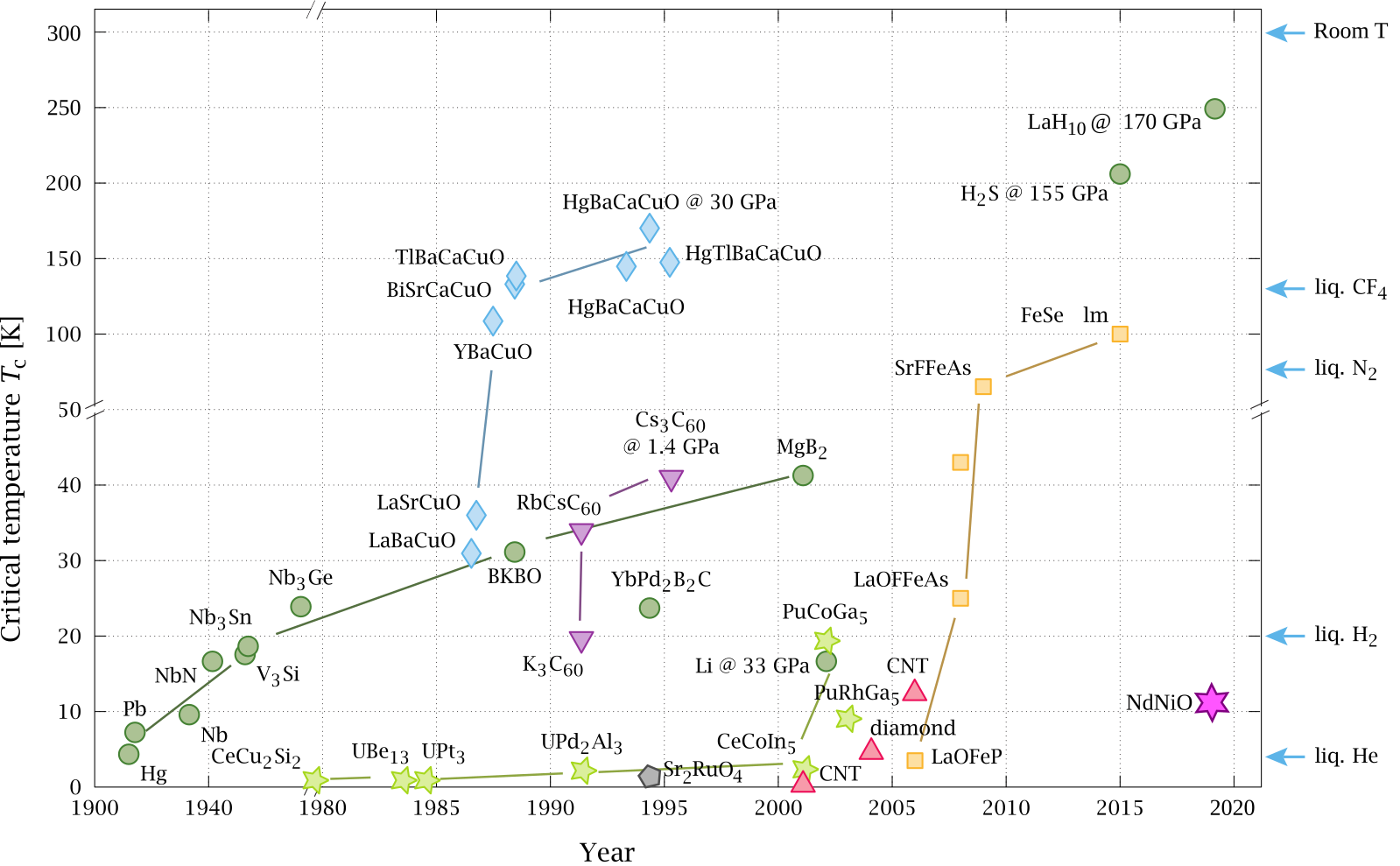 Overview of different superconductors discovered from 1911 to 2015. Different colours and symbols refer to different class of materials. Cuprates are light blue rhombohedra, Iron Pnictides are yellow squares. In some cases, pressure is specified.[PJRay, CC BY-SA 4.0 , via Wikimedia Commons]
