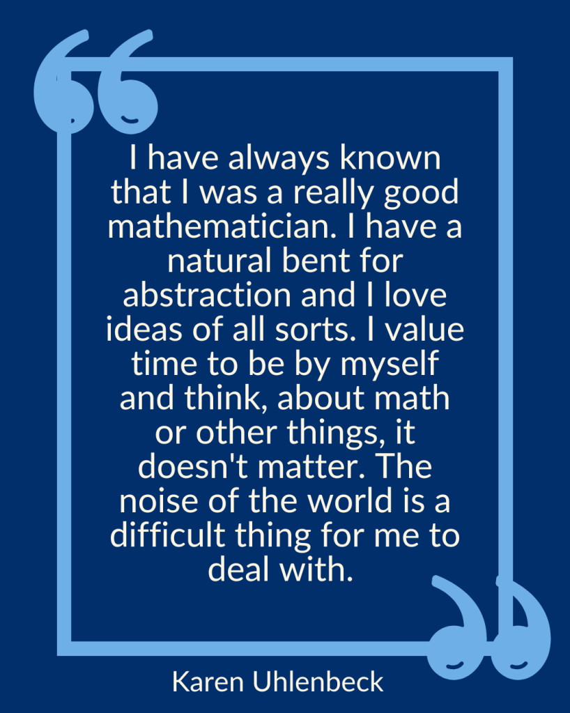 Uhlenbeck is aware of being a role model for girls and women in mathematics and she is aware of the weight that role carries. In her own words, “I may be a wonderful mathematician and famous because of it, but I’m also very human”.